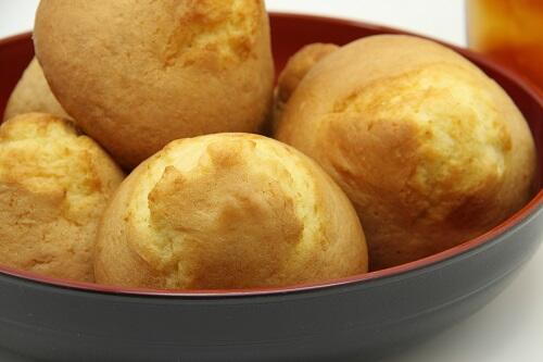 ドーム状の見た目をしている「甘食」は、しぼり袋から絞り出した生地に、十字の切り込みを入れて作っている。また、表面はツルツルしており、中はパサパサとした食感であるのが特徴だ。口に入れると水分が奪われてしまいそうになるので、ホットミルクなどと一緒に美味しく食べるようにしよう。