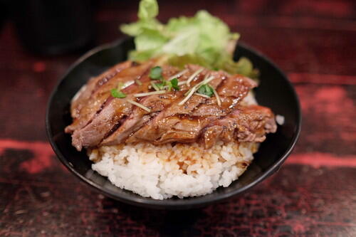 - どんぶりにご飯を入れて、ステーキを乗せる