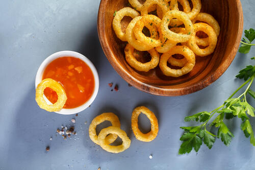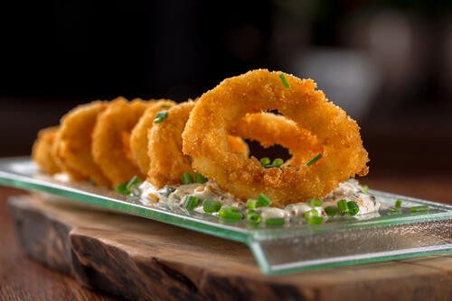 オニオンリングを揚げる温度は、175~190℃が理想的とされている。たまねぎの内部はしっかりと火が通っていなくてはならないものの、衣の部分はカリッと揚げるのが理想的なオニオンリングとされている。これは誕生以来変わらない、オニオンリングの基本であろう。