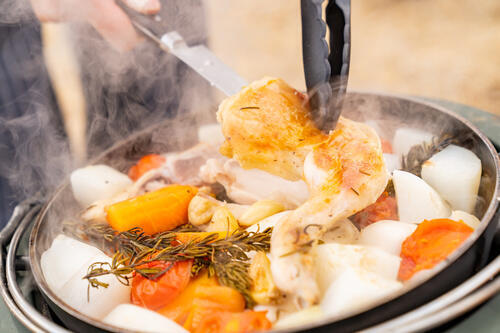 - ダッチオーブンを火にかけ、煙が出てきたら食材を入れて蓋をする。蓋と鍋の間には隙間を作る。