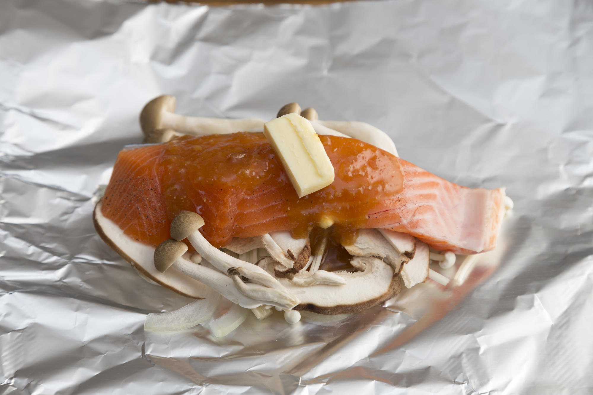 野菜やきのこ類を食べやすい大きさに切ったら、いよいよアルミホイルに入れるが、野菜やきのこ類を敷いてから、鮭をのせるようにしよう。アルミホイルに直接鮭を置くと、くっついてしまう恐れがあるためだ。なお、鮭が崩れ落ちないように、なるべく平坦にすることができる食材を一番下に敷き、残りの食材は鮭の上や横に置くという方法もある。多くの食材を使う場合は野菜やきのこで鮭を挟むようにしてもよいだろう。