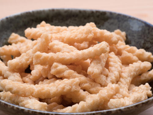 かっぱえびせんは、香り高い海老の風味が魅力。ラーメンなどの麺類やチャーハンなどのトッピングにも向いている。袋に入れて砕いて使うとよい。そのほか、揚げ玉のかわりにお好み焼きの具材にするのもおすすめだ。サクサクの食感もよいアクセントになる。また、サラダのトッピングにも向いている。