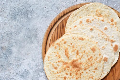 トルティーヤを焼きすぎると固くなって包みにくくなったり、食感が悪くなったりするので注意しよう。生地がぷくっと膨らみだしたら裏返してサッと焼く程度にとどめておくとよい。