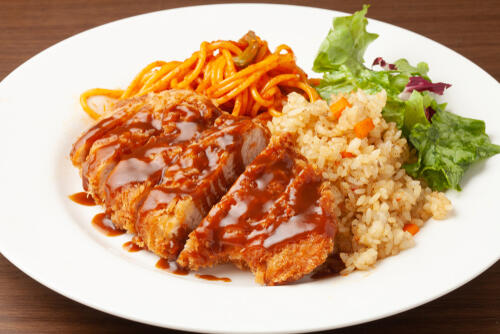 スパゲッティを茹で始めたら、同時にポークカツを揚げよう。もし可能ならフライパンでカレーピラフも作っておこう。コンロが足りない場合は、炊飯器でピラフを炊いておいてもよい。完成したらポークカツの油をきり、その間にナポリタンを作ろう。できた順から盛り付ければ完成だ。