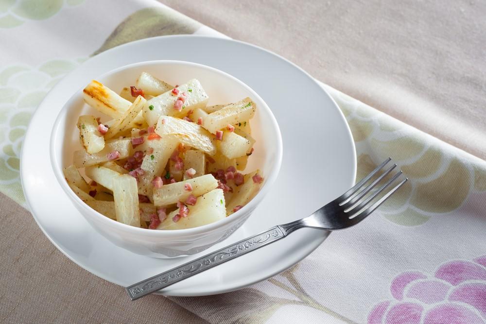 大根料理の基本は煮物だ。厚さ3~4cmに輪切りにして皮を剥き、角を面取りする。そのまま、または半分に切って、おでんやふろふき大根にしたり、鶏もも肉や豚バラ肉、ブリやイカと煮込んでもうまい。