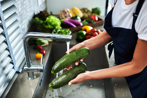 ズッキーニの下処理では、まず流水でよく洗うことが大切。少し表面にべたつきのあるような質感の皮であるため、しっかり洗って汚れを落とそう。