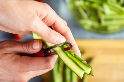 ピーラーでカットすることのメリットは、その食感と見た目。柔らかく、シャキシャキとした舌触りは、サラダやマリネなどの料理にもおすすめだ。その見た目も、透き通るような薄さとグリーンのグラデーションが美しい。個性的なカッティングは、盛り付けまで楽しめるはずだ。