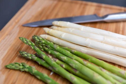 見栄えをよくするためには、緑色の皮も多少は残っていた方がいいだろう。どこまで皮をむくかは、その時期によって見極めなくてはならない。ちなみに、アスパラガスの中でも、ホワイトアスパラガスは、とくに皮が固い種類。ホワイトアスパラガスに限っては、旬の時期かどうかは関係なく、穂先以外の皮を厚めにむいておいた方が安心だ。