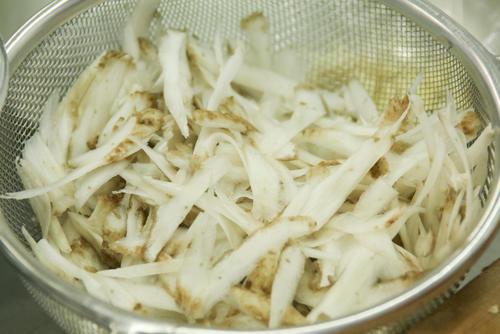 まずはごぼうを適当な長さにカットして、それから縦に薄くスライスしよう。薄くスライスしたごぼうを何枚か重ね、細く千切りにしていく。