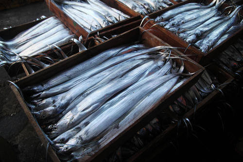 細長い体型が特徴の太刀魚(たちうお)。うろこがなく銀箔のような光沢があり、見た目が刀に似ていることから太刀魚と名付けられたという説、または、海の中で頭を上にして体をくねらせながら泳ぐ姿から立ち魚→太刀魚となったという説もある。