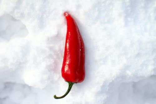 この「S-30」を中心とした3種類ほどの唐辛子を天然塩で漬けて2ヶ月かけてアク抜きをし、1月の厳冬期の3、4日間雪の上にさらす。唐辛子の上にはさらに雪が積もり、雪が塩分を吸って唐辛子の辛さをまるくして旨みが増し、甘みが高まるという。さらに、雪に含まれる水分によって種まで柔らかくなるため、加工もしやすくなるそうだ。そのため、この「雪さらし」と呼ばれる工程は非常に大きな意味を持つのだという。