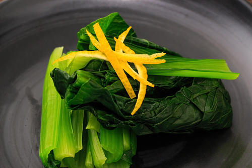 合わせ地ができたら、茹でた小松菜の水気をしっかり切り、根元を切り落とす。4cm~5cmの長さに切ったら、バッドに並べよう。合わせ地を注ぎ入れ、小松菜をひたしていく。平らなバッドに並べてひたすことで、合わせ地が小松菜に均一にしみ込み、美味しくなる。器に合わせ地とともに盛り付けたら、削り節や刻んだ柚子の皮などを添えて、できあがりだ。作り方において、ひたす工程は重要。美味しい小松菜のおひたしに仕上げるため、味をしっかりと染み込ませて欲しい。