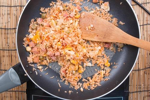 ちなみにチャーハンを作る時のご飯は、冷や飯でも温かいご飯でも構わない。冷や飯の場合は、ダマになりやすく、熱いご飯の場合は水分が多くヌメリがある。どちらも難点があるが、ご飯をじっくり焼きつけるという基本さえ守れば、仕上がりはどちらもパラパラになる。