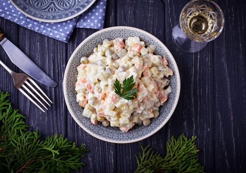 マヨネーズの消費国ナンバー1として、最近話題になった国・ロシア。バケツサイズのパッケージに入ったマヨネーズを家庭で購入するなど、寒いゆえか、さまざまな料理に高カロリーなマヨネーズを多用するらしい。中でも代表的な定番メニューが、正月や祝いの席でも食べるという「オリヴィエ・サラダ」。元祖ポテトサラダのような料理で、作り方は以下の通りカンタンだ。