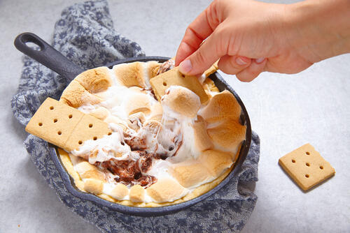 *スキレットを使ってできる定番のスイーツ「スキレットスモア」。小さなサイズのスキレットを使えばソロキャンプでも簡単にセルフスモアが楽しめる。あたたかく甘いスモアは、ソロキャンプにぴったりの簡単スイーツだ。ぜひ試してみてほしい。