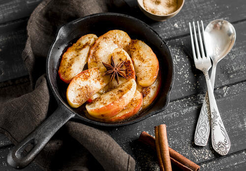 - りんご丸ごとの場合は、アルミホイルに包みダッチオーブンに入れるか、炭火を焚いた網の上に置く。スライスしたりんごの場合はスキレットに並べ砂糖をまぶして火にかける。