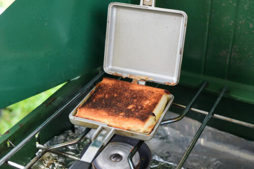 *甘味の中に程よい塩味が効いていて、おやつとしてはもちろんのこと、おなかの足しに、ソロキャンプの朝食にと、使える簡単スイーツだ。ホットサンドメーカーがないときは、アルミホイルに包んで焼いた後、焼き色を付けるためにアルミを外してサッと焼くのがコツ。
