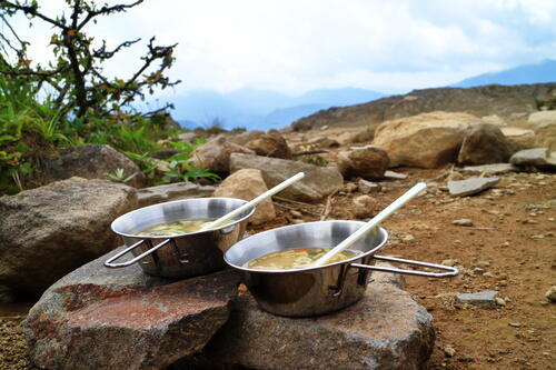 シェラカップの素材はチタン、ステンレス、アルミが使われていることが多く、どれも錆びにくいため扱いやすいところも魅力的だ。シェラカップに料理が盛られたさまは、レトロな雰囲気が漂いSNS映えもしそうだ。