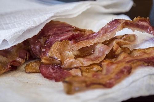 耐熱皿にペーパーを2枚敷き、ベーコンを重ならないように並べて、その上にもう1枚ペーパーを重ねる。ラップをせず電子レンジで2分程加熱。フライパンいらずで油ハネもなし!