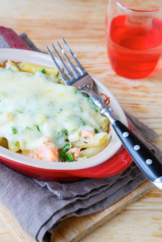 ホワイトソースを作り(市販でも可)、焼いてひと口大に切ったサケ、炒めた玉ねぎと茹でたほうれん草を入れて煮込み、グラタン皿に移したら、チーズとパン粉を
