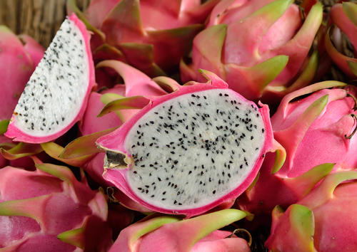 ドラゴンフルーツの中で最も流通しているのは果肉が白いホワイトピタヤ(ピタヤはドラゴンフルーツの別称)だが、運が良ければレッドピタヤに出会えることもあるだろう。レッドピタヤは目が冴えるようなピンク色が特徴で、その鮮やさを生み出す色素「ベタシアニン」は他のピタヤには含まれていない。このベタシアニンは抗酸化作用があると言われており大変ありがたいものなのだが、汁が服に付くと取れない場合があるので気を付けて欲しい。
