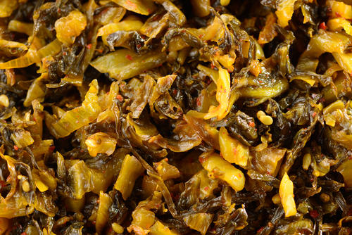 この葉を塩漬けして作られる。そのままでたべるのはもちろん、油炒めにされることも多い。