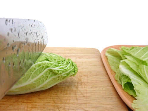 まず白菜は、葉と茎の部分に分ける。葉はざく切りに、茎の部分は包丁の刃を少し斜めに入れ、削ぐように切ろう。茎の部分を削ぐように切るのは、断面を増やして味しみをよくするためだ。火を通すときの出汁の旨みはもちろん、ポン酢やごまだれなどのつけだれを絡みやすくすることが目的の切り方である。