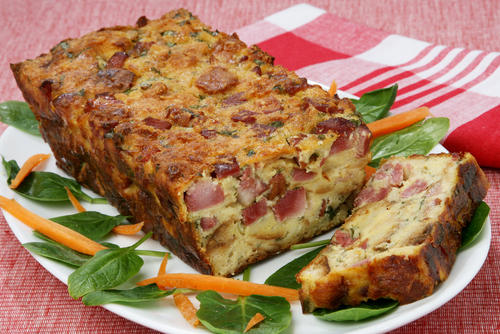 切った時の断面を美しく見せるには、彩り豊かなブロッコリー、ベーコン、パプリカ、トマト、茹で卵などを使うとよいだろう。生地が黄色なので、緑、赤、ピンクなどの鮮やかな色が映える。茹で卵を使う場合は、鶏卵よりも小さなうずらの卵がおすすめ。生地に混ぜ込み、ランダムに断面を見せるのもよいが、生地へ一列に埋め込んだりすると切り分けたときに美しい断面となる。