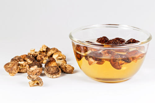 キノコを戻したら、ぜひ捨てずに利用したいのは戻し汁である。戻し汁には旨み成分グアニル酸のほかにも栄養素が含まれており、栄養価の高い出し汁として料理に最適なのだ。すぐに戻し汁を使わない場合は冷蔵庫に保存する、あるいは製氷皿に入れて冷凍しておけば長期保存も可能だ。