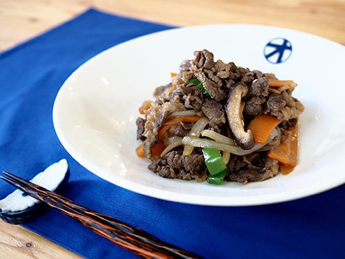 3.フライパンに薄く油をひいたら強火にかけて、漬けダレに漬けておいた牛肉を加え炒め始める。肉の色が変わってきたら、野菜を加えてさらに炒める。野菜がしんなりしてきたら味見をしてみよう。物足りなければ塩、砂糖、醤油などで味を調えて完成だ。