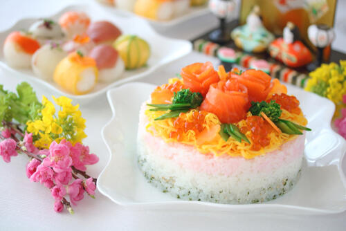 最初に紹介するひなまつりのおすすめメニューは、子どもに喜ばれるにちがいない寿司を中心にしたメニューだ。ひなまつりといえばちらし寿司が定番だが、ひなまつりケーキに見立てたケーキ寿司を作る人が増えているという。作り方は、ケーキ型にラップを敷き、桜でんぶ・パセリ・椎茸を混ぜた寿司飯を詰めて押し、上下を返し皿にうつす。バラの形にしたサーモンを真ん中におき、錦糸卵やパセリをトッピングすれば完成だ。