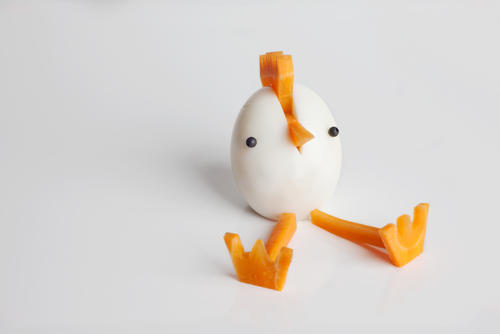 うずら卵の水煮に、コーンのくちばしと焼き海苔を切った目をくっつけるだけの、簡単飾り。コーンは細めのスパゲッティで刺して固定するが、食材の水分でやわらかくなっていくため、ゆでずに使うことができる。焼き海苔は、丸く切り抜けばパチクリとした目になり、細く切れば目を閉じているような表情となる。マヨネーズを薄く塗ってうずら卵に貼り付ける。細かい細工はメイクで使用する眉用のハサミでカットするとやりやすい。
