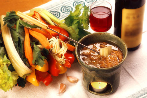 シンプルな料理だけに野菜も選りすぐりを用意したい。チコリ、カブ、レンコン、パプリカ、ズッキーニなど、季節の旬菜を下準備しよう。野菜を1口大に切って皿に盛り、テラコッタの鍋にバーニャカウダを入れてキャンドルで温めて熱々にしておけば、テーブルの準備はOKだ。市販品もあるが、手作りすると数段美味しいので、ぜひトライしてみよう。