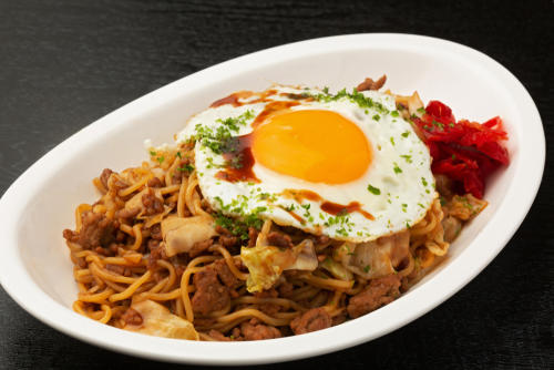ちなみに、焼きそばとは表記せず「やきそば」とひらがなで統一されているのは、横手という地名を目立たせるという理由からなのだそう。キャベツや豚挽き肉と一緒に炒めた太麺に、辛味を抑えたたっぷりソースがからまり、麺の上にはトロトロの半熟目玉焼きと福神漬けが添えられているのが特徴である。ベーシックなソース焼きそばとはいえども、あなどれない歴史と味わいをもつ。