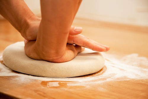 次はこねる段階。手のひらでぐっと押すようにこねる。よく練るのは大切だが、手早くするのがコツ。だんだんと表面が滑らかになってきたら、1度丸めて、ボウルのヘリなどを利用して、円錐形に仕上げる。これはへそだしなどと呼ばれる。これを上からぎゅっと潰すと綺麗な円形になる。