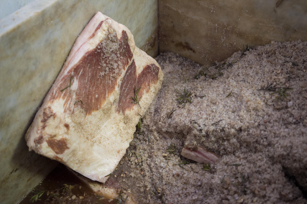 ルネサンス時代の天才芸術家ミケランジェロ。名高いダビデ像などに用いたカッラーラ・ビアンコと呼ばれる純白の大理石の産地が、トスカーナ地方にある町・カッラーラだ。その奥地、コロンナータ村の特産品が、なんと大理石の中で豚脂を熟成させるという「ラルド・コロンナータ」。これは、豚の脂に塩とローズマリーなどのハーブや胡椒などをすり込み、大理石の桶に入れ、最低半年ほど熟成させもの。もともとは採石作業に従事する石工たちの冬場の労働食だったという。