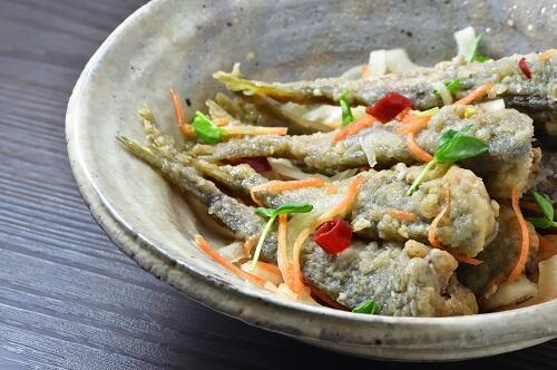 南蛮漬けは魚に片栗粉をつけて揚げ、野菜と一緒に甘酢に漬けた冷菜である。骨があると食べにくい料理なので、骨なし魚が重宝する。南蛮漬けは青魚が合うので、サンマやサバ、アジなどがよいのではないだろうか。