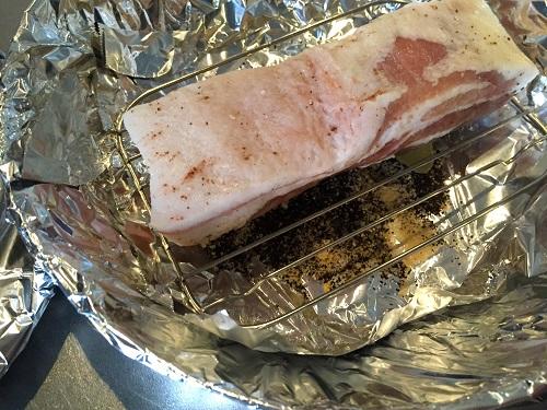 ゆで卵、プロセスチーズの燻製は時間をかけずに作ることができる。15分ほどでしっかり燻製色がつき、とても美味しい。そのほか、豚のバラ肉を使ってベーコンもどきを作ることもできる。ポイントは、下処理として豚肉に塩と砂糖、オールスパイスをもみ込んでおくこと。燻す時間は30〜40分ほどでOKだ。食べるときは、肉汁が出ないよう、粗熱が取れてからカットすること。