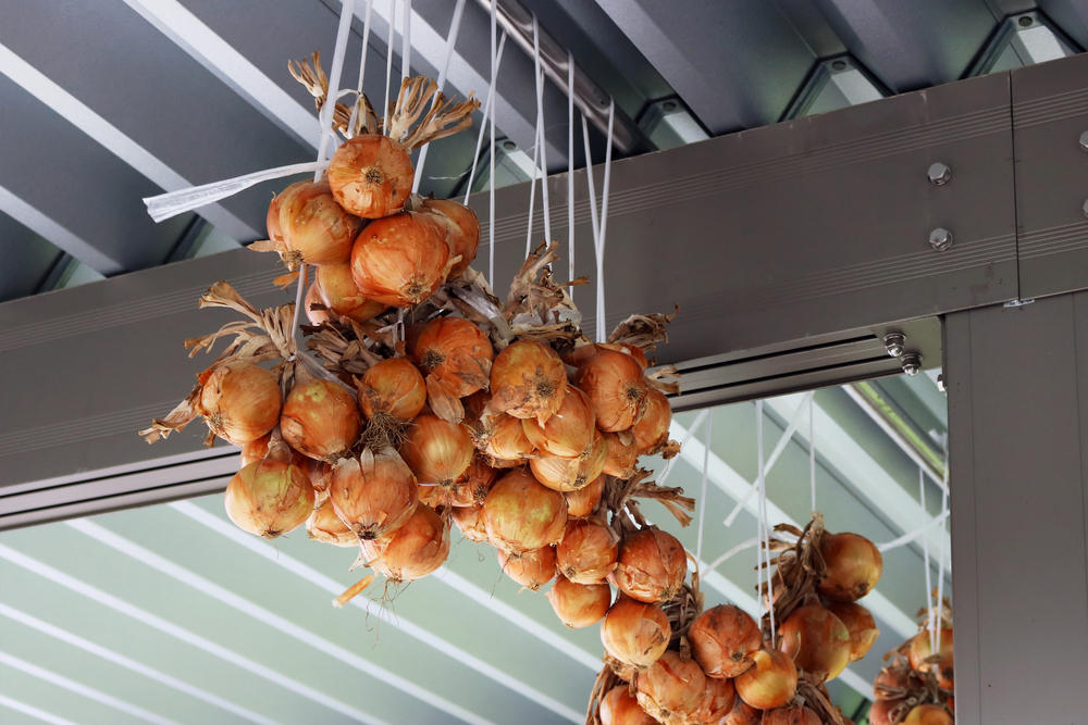 ポリ袋に入って売られていることが多い玉ねぎだが、湿気や高温には弱いので通気を良くすることが肝心。購入後はただちにカゴなどに入れて冷暗所へ置いて保存しよう。吊るすとより効果的なので、日陰の風通しの良い場所にネットなどに入れて下げておくと良いだろう。