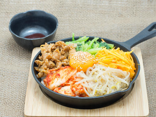 ビビンパも、ワンパンメニューにぴったり。野菜類は電子レンジで加熱すれば、茹でる必要なし。まずはフライパンで肉を炒めて甘辛く味つけたら、一度取り出しておく。冷やご飯を使う場合は、事前に温めておくとよい。再度洗って、ごま油をひいたフライパンにご飯を敷き詰め、ナムルと肉をトッピング。パチパチと底から音が聞こえて、香ばしい匂いがしてきたところで火を止めれば、お焦げまで楽しむことができる。卵をトッピングして、混ぜながら食してもよいだろう。