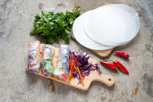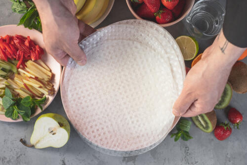油で揚げて作る春巻きの場合、薄力粉や片栗粉などを使って皮を作っていく。しかし、生春巻きを作る場合は、ライスペーパーという米粉を原料とした皮を使用するのが一般的だ。「小麦などを原料としているのは春巻きの皮」「米などを原料としているのは生春巻きの皮」と覚えておくとよいだろう。