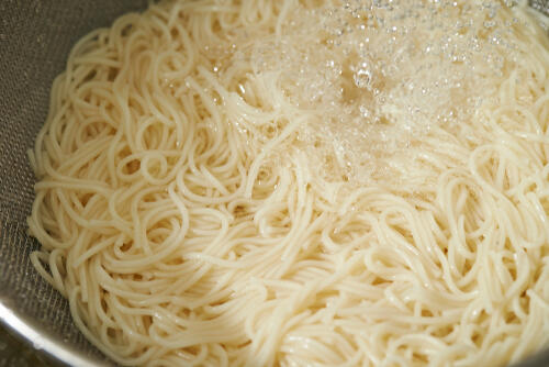 まず、沸騰した鍋にそうめんを入れて茹でていく。柔らかくなるまで茹でてしまうと、後々ブヨブヨのそうめんに仕上がってしまうおそれがあるため、芯が少し残っているくらいの硬さで引きあげよう。また、そうめんを引きあげたあとは水をよくきることが大切だ。びしょびしょのまま、そうめんを放置してしまうと食感の悪い麺になってしまうため、注意が必要だ。そして、水をよくきったあとはそうめんにサラダ油をまぶしておく。