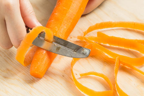 にんじんやごぼうなどはできるだけ薄く皮をむく。野菜の芯にいくほど硬く、皮の下が柔らかく美味しいからである。特にごぼうは、ピーラーや包丁で皮をむくと厚くむけてしまうので、包丁の峰や鬼たわしでこそげるように薄くむくようにする。