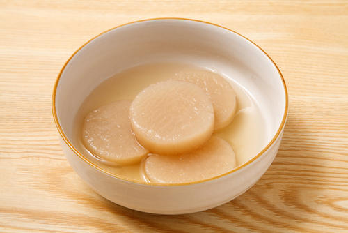 ふろふき大根やおでんに入れる大根の下側に入れる切れ込みのこと。十字に切り込みを入れて調味料が大根にしっかり含まれるようにしたり、火の通りを早くしたりするために隠し包丁を入れる。見映えをよくするために、隠し包丁は必ず食材の裏側に入れる。盛り付けた時には切り込みの入っていない表側だけが見えるのである。