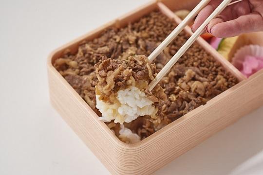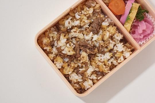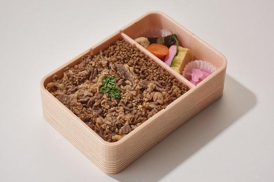 フタを開けてみると、ごはんが見えないほどぎっしりと牛肉が敷き詰められている。でも、その名の由来は直球ストレートな「牛肉弁当」ではない......。牛肉を底から支えているのは、山形県産米の「どまんなか」。山形県のオリジナル品種である「どまんなか」は、山形のような中間山地での栽培に適していて、冷めてもふっくらとおいしい、弁当にぴったりの米。そう、弁当の名前のなかには、米どころらしい名前が隠れていたのだ。