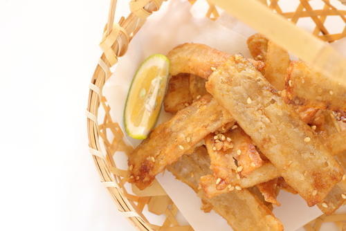 レンコンは、ゴボウ同様薄めに切っても食べられるが、オススメは5mmくらいの厚さ。こちらもゴボウ同様、酢水にさらしてアクを抜き、水気を拭いてから、揚げるだけ。中火でカラリと揚がればできあがり。レモンをたっぷり絞っていただこう。