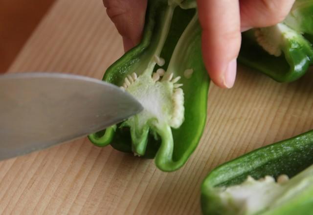 肉詰めを作る際、ピーマンから肉が離れないようにする方法として、なんと種を残したまま詰めるというやり方がある。実は、ピーマンの種やワタは問題なく食べることが出来、食べてもほとんど気にならないという。実際に編集部でもやってみたが、本当にすべての肉がはがれることなく作ることが出来た。また、食べる際に種やワタが気になることもなく、苦みを感じることもなかった。