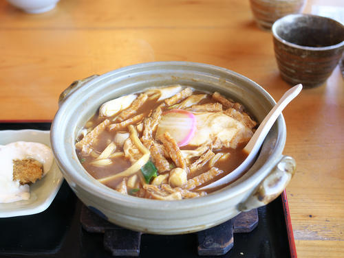 普段食べているうどんを想像して食べると、まだ煮えていないのではないかと思うほど麺が固い。味噌煮込みうどんの麺は小麦粉と水だけで作られている。塩が入っていないので、茹でても弾力が出ず固く仕上がるのだ。熱々の土鍋で食べ終わる頃には麺の芯が抜けて食感が変わるので、そこも楽しもう。