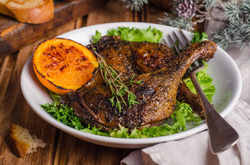 もっともよく知られている鴨料理と言えるのが、鴨のコンフィ。コンフィとは低い温度の油でじっくりと加熱した料理のこと。冷蔵庫がまだない時代、肉の保存のために生み出されたいわば生活の知恵。加熱後、そのまま冷やすと固まった脂肪で肉が覆われる。これにより、腐敗を防ぐのだ。レストランやビストロでは、骨つきの鴨をコンフィにしていることが多い。ほろっと口でほどける肉質は、病みつきになるはず。