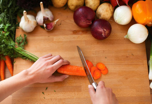 野菜を切る。大きさは好みでよいが、もしひき肉と食感を合わせたいのであれば、細かくみじん切りにするとよいだろう。特ににんじんや玉ねぎなどの火が通りにくい野菜については、他の具材に対して大きくなり過ぎないよう注意しよう。そうすれば、具材への火の通り具合のムラを減らすことができる。ゴロッとした野菜の食感を味わいたいのなら、あえて大きめに揃えるのもありだ。